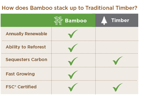Anyone who has ever planted bamboo in their yard can attest to the fact that bamboo grows rapidly and can easily reforest. Because it can be harvested annually, it reduces any clear cutting compared to timber, which is vulnerable to illegal logging. Bamboo reaches full maturity in 10 years or less, unlike timber which can take a minimum of 15 years and up to 80 years.